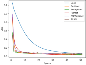 Under the same configuration environment and dataset, a comparative training was conducted on three advanced baseline network methods [Unet (38), ResUnet (47), and PSPnet (42)], as well as three autonomously improved networks based on the foundational architecture (ResAgUnet, PSPResUnet, and PCAN). Figure 5 shows the convergence of training loss values for different networks across various epochs. Among them, the Unet exhibited the slowest loss convergence speed, requiring approximately 50 epochs to approach the loss values of other networks. The training loss convergence speed of the PSPnet showed a significant improvement compared to Unet, demonstrating that the pyramid scene parsing (PSP) module enhances the feature learning capability of the network in small-sample learning tasks. Additionally, the training loss convergence speed of ResUnet also improved considerably compared to Unet, indicating that the residual module facilitates better feature learning. Furthermore, the loss convergence speed of ResAgUnet showed further improvement over ResUnet, indicating that the attention module enhances the network’s feature learning capability even more. The training loss convergence speed of PCAN was close to that of ResAgUnet, inheriting the feature learning advantages of both the PSP module and the attention module.
