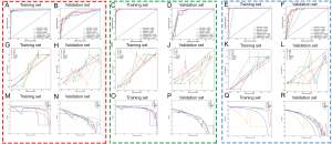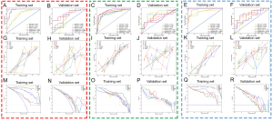 Univariate analyses, LASSO selection, 10-fold cross-validation, bidirectional elimination, and ICCs were performed for feature selection. In dataset A, this process yielded 4, 2, and 5 key features from unenhanced, CMP, and NP CT images, respectively; in dataset B, 9, 3, and 12 features were extracted from CMP, NP, and fusion (CMP + NP) CT images, respectively (9-11). The identified radiomic features are summarized in Table S3.