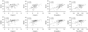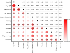 The correlation between MoCA scores in different cognitive domains and GMV in different brain regions was further assessed, as demonstrated in Figure 3. Spearman’s analysis revealed a correlation between left lingual gyrus gray matter atrophy and visuospatial and executive function, attention, language, and delayed recall scores. The correlation was most significant in the domain of attention (r=0.428, P<0.001). Right lingual gyrus gray matter atrophy correlated with visuospatial and executive functioning, naming, attention, language, and delayed recall, with the greatest correlation being in the area of attention (r=0.383, P<0.001). Right amygdala volume changes correlated with all cognitive subdomains, mainly in delayed memory (r=0.411, P<0.001) and attention (r=0.409, P<0.001). Volume changes in the mid-dorsal nucleus of the thalamus correlated with attention, language, delayed recall, and orientation, focusing mainly on orientation (r=0.323, P=0.001) and language (r=0.319, P=0.001).