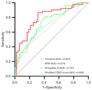The AUC of modified CSVD score, MTA, right amygdala GMV, and the combination of the three. AUC, area under the curve; CSVD, cerebral small vessel disease; GMV, gray matter volume; MTA, medial temporal lobe atrophy; ROC, receiver operating characteristic.