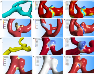 In this study, Fluent 2021 R2 finite-volume analysis software (Ansys Inc.) was used to construct the medical subject headings (MeSH) vascular model for hemodynamic analysis, and the Navier-Stokes equation was used to govern the simulation process. During each cardiac cycle, 800 steps were simulated (0.01 seconds per step), with three cardiac cycles being simulated and data being exported from the most recent cardiac cycle. The exported calculation results were saved as CDAT files for analysis, and the obtained image data were postprocessed via CFD Post 2021 R2 software (Ansys Inc.). Additionally, to assess shear-thinning effects, four representative aneurysms were re-simulated via the Carreau-Yasuda model under identical settings; the results did not materially change our conclusions.