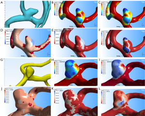 In this study, blood was assumed to be a Newtonian fluid, and energy transfer and gravity were not considered. The basic equation for controlling flow is the 3D viscous incompressible equation, in which the wall of the IA is assumed to be rigid, without sliding boundaries, and the effects of wall thickness and elasticity on hemodynamic parameters are ignored. The blood flow conditions at the entrance of the vessel were set on the basis of the pulsatile flow velocity measured by transcranial Doppler (TCD) ultrasound [the average flow velocity at the entrance of the internal carotid artery (ICA) in patients aged 40 to 60 years was 0.92±0.10 m/s according to TCD] and the outlet pressure condition (no stress; i.e., the static pressure value was 0). For each case, inflow was scaled to parent artery diameter (Qcalc = A × Vref), and outlets were set to pressure (0 Pa) with flow split equally or by Q∝D3.
