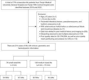 Between January 1, 2016, and May 31, 2022, we initially identified 779 consecutive patients with documented IAs based on cranial computed tomography angiography (CTA) or digital subtraction angiography (DSA) imaging from the radiology information systems of Tianjin Medical University General Hospital and Tianjin Fifth Central Hospital.