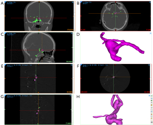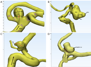 Mimics Research 21.0 (Materialise Inc., Leuven, Belgium) software was used to create a 3D model of the IA on the basis of CTA and DSA images stored in Digital Imaging and Communications in Medicine (DICOM) format (Figure 2), and the geometric morphology of the aneurysm was measured after reconstruction (Figure 3A). Representative models illustrating inflow direction, bleb location, daughter sac, and regional division into neck, body, and dome are shown in Figure 3B-3D. All aneurysm models were reconstructed from multidetector CTA (slice thickness 0.5–0.625 mm) or 3D rotational DSA (voxel size 0.10–0.20 mm). Magnetic resonance angiography (MRA) was not used due to its lower spatial resolution and flow-related artifacts, which might have biased the morphological assessment. Table S1 provides definitions of the morphological parameters. We referred to Salimi’s concept of dividing IAs into three regions (non-software partitioning method): the neck, body, and dome (16).
