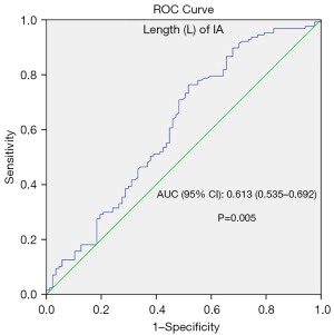 IA size is currently an important geometric morphological parameter for predicting the risk of IA rupture. The ISUIA reported that the annual rupture rate was 0.05% for IAs <10 mm and 1% for IAs ≥10 mm. In the ISUIA, an IA size of 10 mm was used as the threshold for rupture risk, which is highly controversial, and numerous other clinical studies have revealed that most ruptured IAs are <10 mm in size (7,8). In our study, the rate of medium-sized aneurysm rupture (67.4%) was higher than that of small-sized aneurysm rupture (44.7%) (P=0.001). Our ROC curve analysis identified 3.87 mm as the optimal threshold for rupture prediction (AUC =0.613), with a sensitivity of 0.71 and a specificity of 0.55, indicating that more than 40% of ruptured aneurysms were smaller than 5 mm, even after location and SR were accounted for. Although the overall rupture rate increases with aneurysm size, numerous studies, including ours, have found a considerable proportion of ruptured aneurysms are smaller than 5 mm. For instance, a Chinese single-center study of 1256 cases of sporadic ruptured cerebral aneurysms reported that 38.6% of ruptured IAs were smaller than 5 mm in diameter (27), which is consistent with our findings.