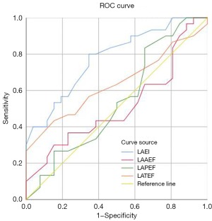 According to the NYHA cardiac function classification criteria, the severe AS group with preserved ejection fraction was divided into subgroup A and subgroup B. Subgroup A consisted of patients with cardiac function grades I and II without significant heart failure symptoms, and subgroup B consisted of patients with cardiac function grades III and IV accompanied by significant heart failure symptoms, as the results of the study in the two subgroups showed: among the LA emptying rate parameters, LAAEF, LAPEF, and LATEF were not statistically different between the two groups (P>0.05). Compared with subgroup A, the LAVImax of subgroup B increased (P<0.05), and the LAEI reflecting LA reserve function was lower than that of the control group (P<0.05). The absolute values of longitudinal strain (LASr, LAScd, LASct) and circumferential strain (LASr-c, LAScd-c, LASct-c) in the three phases of LA decreased (P<0.05). The results of the correlation analysis in this study showed a significant negative correlation between LASr and NT-proBNP, E/e’, and LAVImax, and a significant positive correlation with LAEI and LVGLS. The ROC curve was used to predict the diagnostic efficacy of LA emptying rate parameters and strain parameters for heart failure in patients with severe AS with preserved ejection fraction: the AUC predicted by LASr and LAEI was the largest, 0.855 and 0.818, respectively. The cutoff values were 16.5% and 97%, respectively. The sensitivity was 76.7% and 83.3%, respectively. The specificity was 80% and 65.4%, respectively, and the Youden index was 0.575 and 0.487, respectively. The results of this study applied univariate regression analysis and showed that LAVImax, LAEI, and LASr were significantly associated with the presence of significant heart failure symptoms in patients with severe AS with preserved ejection fraction, and the results of multivariate regression analysis showed that LAEI and LASr were positive predictive factors for severe AS patients with preserved ejection fraction for development or presence of class III and IV heart failure. The above results indicate that the LA size of patients with severe AS with grade III and IV heart function and significant heart failure symptoms is larger than that of patients with grade I and II heart function and no significant heart failure symptoms, which is consistent with previous studies. In addition, symptomatic patients showed more pronounced LA dysfunction, characterized by significant impairment of LA reserve, pathway, and contractility. The parameters of LAVImax, LA longitudinal strain, and circumferential strain show high sensitivity in distinguishing the severity of heart failure in patients with severe AS heart failure who have preserved ejection fraction. The correlation analysis indicates that LA function parameters serve as key ultrasound detection targets for heart failure symptoms in patients with severe AS heart failure who have preserved ejection fraction, and are closely related to LV filling pressure and LV contractility. It is worth noting that in the ROC analysis, the AUC of LASr and LAEI was the largest, which indicated that the LA emptying rate parameter and strain parameter representing the LA reserve function were sensitive to identify patients with severe AS with significant heart failure symptoms with ejection fraction retention. Through multi-factor logistic regression analysis, it was further revealed that LAEI and LASr were positive predictive factors for severe AS patients with preserved ejection fraction for development or presence of class III and IV heart failure. The cutoff values of LASr and LAEI provide valuable information for the clinical diagnosis of severe AS patients with heart failure with preserved ejection fraction, and the results of these findings are similar to those of Mateescu et al. (25).