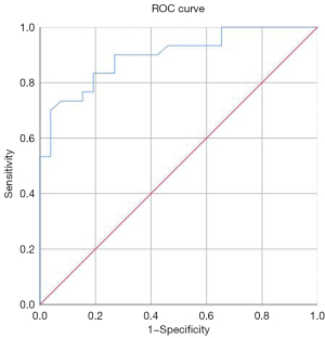 The results of the ROC curves for the LA emptying rate parameter and the strain parameter showed relatively large area under the curves (AUCs) for NYHA class III and IV in patients with severe AS with preserved ejection fraction as predicted by LASr and LAEI. LASr: AUC was 0.855, cutoff value 16.5%, sensitivity 76.7%, specificity 80%, Youden index 0.575. LAEI: AUC was 0.778, cutoff value 97%, sensitivity 80.0%, specificity 65.4%, Youden index 0.454 (Figures 5,6). LASr combined with LAEI predicted preserved ejection fraction of the ROC curves for NYHA class III and IV in patients with severe AS, with an AUC of 0.897, sensitivity of 70.0%, specificity of 96.2%, and Youden index of 0.662 (Figure 7).