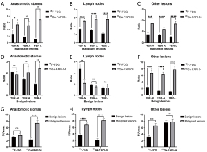 The measured values of 68Ga-FAPI-04 were all significantly higher than those of 18F-FDG in terms of TBR-M (2.35±1.80 vs. 6.66±3.25; P<0.0001), TBR-A (1.43±0.65 vs. 6.39±2.93; P<0.0001), and TBR-L (7.77±4.53 vs. 1.04±0.44, P<0.0001). These results may imply that 68Ga-FAPI-04 has a stronger binding ability to certain targets in postoperative benign lesion tissues, thus producing a higher uptake level than 18F-FDG in imaging. The higher TBR values suggest that 68Ga-FAPI-04 may more effectively distinguish these lesions from the surrounding normal tissues.A comparison of all semiquantitative parameters is provided in Figure 5 and Tables 3,4.