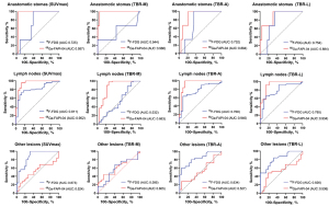 A comparison was made between the diagnostic efficacy of two tracers, 18F-FDG and 68Ga-FAPI-04, with reference to anastomotic sites, lymph nodes, and other lesions, based on various parameters, including SUVmax, TBR-M, TBR-A, and TBR-L. The indicators included area under the curve (AUC), 95% confidence interval (CI), P value, cutoff value, sensitivity, and specificity, which provided comprehensive data for evaluating the diagnostic performance of the two tracers at different lesion sites.