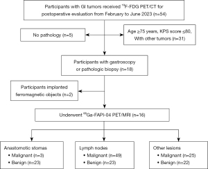 This retrospective clinical investigation was carried out at the First Affiliated Hospital of Anhui Medical University from February 2023 to June 2023. A total of 16 participants were enrolled based on a comprehensive evaluation integrating imaging findings, clinical assessments [including age and Karnofsky performance status (KPS) score], and pathological results. The study protocol received approval from the Institutional Review Board (IRB) of the First Affiliated Hospital of Anhui Medical University (ethics No. PJ2022-05-09) and this study was registered in ClinicalTrials.gov (identifier: NCT06270394). This study was conducted in accordance with the Declaration of Helsinki and its subsequent amendments. All participants provided their written informed consent prior to their enrollment in the study. The inclusion criteria were as follows: (I) surgical treatment; (II) postoperative histopathological confirmation of GI malignancy; and (III) no history of other tumors. Due to the relatively long scanning time of PET/MRI, the exclusion criteria were set as follows: (I) age 75 years or older; (II) implantation of ferromagnetic objects; (III) a KPS score of 80 or lower; and (IV) claustrophobia. On this basis, these patients were required to have both 68Ga-FAPI-04-avid benign lesions and malignant lesions to enable comparison. For all patients, the median interval from GI cancer surgery to the postoperative surveillance scan that identified suspected recurrence was 15.5 months (range, 1 month to 7 years). Prior to 18F-FDG PET/CT scanning, 6 patients had undergone biopsies; however, all biopsies were performed ≥6 weeks before the 18F-FDG PET/CT scan to minimize inflammatory interference. The detailed flowchart of the study design is presented in Figure 1.