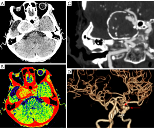 At the time of the current presentation, the patient underwent head CT, computed tomography angiography (CTA), magnetic resonance imaging (MRI), and time-of-flight magnetic resonance angiography (TOF-MRA). CT showed a low-density lesion in the right cavernous sinus, with a clear boundary, a flocculent high-density shadow inside, and ring calcification at the edge (Figure 1A). The CT color map showed the lesion more intuitively than non-enhanced CT image (Figure 1B). CTA showed multiple nodulous protrusions in the lesions, communicating with the cavernous segment of the right internal carotid artery (ICA) (Figure 1C). In addition, two other small aneurysms were observed in the right ICA (Figure 1D).