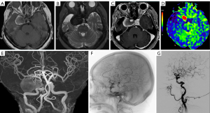 During surgical exploration of partially thrombotic aneurysms, a huge fine vascular network covering the aneurysm and obviously developed blood vessels may also be observed (8-11). This mainly occurs at the periphery of the aneurysm, in the “thrombotic portion” of the aneurysm, away from the patent lumen, with a marked enhanced rim and edematous reaction in the adjacent brain parenchyma, but the precise pathogenesis needs to be elucidated.