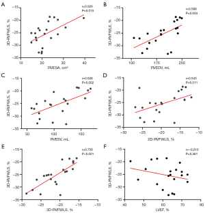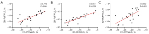 The correlation data between 3D-RVFWLS and 2D-RVFWLS in patients with TPVR are shown in Figure 4. Preoperative 3D-RVFWLS was strongly associated with 2D-RVFWLS before TPVR (r=0.774; P<0.001), 3D-RVFWLS at 1 week after TPVR was strongly associated with 2D-RVFWLS at 1 week after TPVR (r=0.857; P<0.001), and 3D-RVFWLS at 6 months after TPVR was moderately correlated with 2D-RVFWLS at 6 months after TPVR (r=0.662; P=0.001).