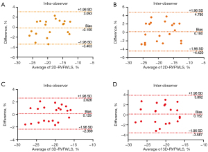 The inter- and the intraobserver reproducibility of 2D-RVFWLS and 3D-RVFWLS were excellent, as reflected by the high intraclass correlation coefficient. In addition, Bland-Altman analysis demonstrated high intra- and interobserver agreement, with low bias and narrow limits of agreement (Table 7 and Figure 6).