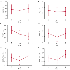 Previous studies (27,28) have demonstrated that RV strain indices derived from 2D-STE can more accurately detect the changes in RV function as compared to conventional RV echocardiographic parameters. RV myocardial strain is independent of the geometry and angle while being less dependent on the load than conventional echocardiographic indicators. In the early stages of several cardiovascular diseases, RV free wall longitudinal strain has been shown capable of detecting subclinical RV dysfunction in the absence of changes in ejection fraction (29-31). Our findings are consistent with the results of previous studies in that 2D-RVFWLS decreased at 1 week after TPVR and gradually improved to the preoperative baseline level during the 6-month follow-up (16,32,33); however, it was lower than that in the control group. As mentioned earlier, 2D-STE is limited by the out-of-plane motion of the speckles, whereas 3D-STE can overcome this and quantify RV function more accurately and objectively in 3D space. There is no literature on the changes in RV function in 3D-STE after TPVR. Our study may be the first of its kind to evaluate RV function after TPVR using 3D-STE, and we found that 3D-RVFWLS decreased at 1 week after TPVR and recovered to the preoperative baseline level at 6 months after TPVR.