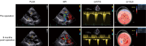 Mean septal thickness decreased from 26.0±4.1 mm preoperatively to 18.0±3.9 mm. Maximal instantaneous LVOT gradients were significantly reduced, from 111.0±44.3 mmHg preoperatively to 26.5±8.3 mmHg postoperatively, demonstrating effective relief of LVOT obstruction. All patients with preexisting MR (≥3+) and systolic SAM (≥2) exhibited notable improvements, with MR grade reduced to ≤2+ and SAM grade reduced to ≤1. Left ventricular GLS improved slightly from 6.6%±3.0% to 9.5%±2.3% (absolute values) on postoperative assessments (Figure 4). Additionally, left ventricular stroke volume, as a surrogate for myocardial contractility, improved significantly in all patients.
