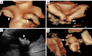 Ultrasonography at our institution revealed the following: Bilateral lateral ventriculomegaly, with a left ventricular width of 47 mm and a right ventricular width of 23 mm (Figure 1A), and a “dumbbell-shaped” moderately echogenic mass (26 mm × 15 mm) anterior to the fetal trachea, encircling the airway with homogeneous internal echogenicity. Color Doppler flow imaging showed no significant vascularity in the central portion of the mass but sparse flow signals peripherally (Figure 1B-1D, and Videos 1,2). Three-dimensional surface rendering confirmed anterior cervical swelling (Figure 1E), a narrowed fetal thoracic cage (transverse thoracic diameter: 48 mm) with an increased cardiothoracic ratio (cardiac transverse diameter: 32 mm), and a ventricular septal defect (2.5 mm) (Figure 1F). Persistently extended upper limbs and a fixed cross-legged lower limb posture without dynamic changes were also observed (Figure 2A,2B and Video 3). The metatarsal bones were poorly visualized, with only phalanges identified in both feet (Figure 2C,2D, and Video 4). The amniotic fluid assessment showed a maximum vertical pocket depth of 106 mm and an amniotic fluid index of 368 mm. The ultrasonographic diagnosis was as follows: (I) severe fetal hydrocephalus; (II) an anterior cervical hyperechoic mass, suggestive of thyroid goiter; (III) a narrowed thoracic cage with increased cardiothoracic ratio and ventricular septal defect; (IV) metatarsal hypoplasia and fixed limb postures; and (V) moderate polyhydramnios. Prenatal umbilical vein puncture confirmed fetal hypothyroidism (TSH: 11.32 mU/L; normal range, 0.38–4.34). The family opted to terminate the pregnancy at an external institution, as in addition to the fetal malformation, the patient was unmarried, and the pregnancy unplanned. Documentation provided by the family indicated that the autopsy findings were consistent with our ultrasound diagnoses, though post-procedure images were unavailable.