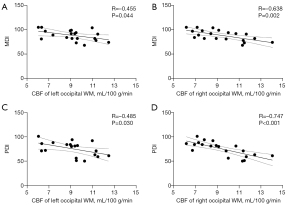 The median corrected age was 3 (interquartile range, 3–5) months at the time of scoring. In BPD infants, left occipital WM CBF was negatively correlated with MDI (R=−0.455, P=0.044) and PDI (R=−0.485, P=0.030) scores, and right occipital WM CBF was also negatively correlated with MDI (R=−0.638, P=0.002) and PDI (R=−0.747, P<0.001) scores (Figure 5).