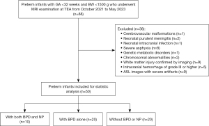 The literature on brain perfusion in preterm infants with BPD remains relatively sparse. Moreover, few studies have applied ASL technology to examine preterm infants with BPD complicated by NP. Therefore, in order to provide a more accurate basis for clinical diagnosis and treatment, this study analyzed the CBF changes in preterm infants with BPD with or without NP using 3D-ASL technology. We present this article in accordance with the STROBE reporting checklist (available at https://qims.amegroups.com/article/view/10.21037/qims-2025-1216/rc).