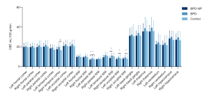 Compared with that in the control group, the CBF in the BPD-NP group was not significantly different (P>0.05), while that in BPD group was significantly higher in the left parietal WM (P=0.046), left occipital WM (P=0.041), right temporal cortex (P=0.021), and right occipital WM (P=0.037). Compared with the BPD group, the BPD-NP group had a significantly lower CBF in the left parietal WM (P=0.041) and right temporal WM (P=0.019). No statistically significant differences in CBF were observed in the other brain regions (P>0.05) (Table 2 and Figure 3).