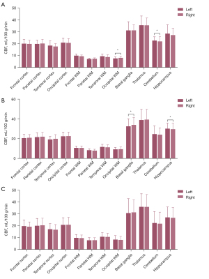 Data analysis was performed with SPSS 26 (IBM Corp., Armonk, NY, USA; https://www.ibm.com/products/spss-statistics), and figures were generated with GraphPad Prism 10.1.2 (Dotmatics, Boston, NY, USA; https://www.graphpad.com). For quantitative data, normality and homogeneity of variance tests were conducted. Normally distributed data are presented as the mean ± standard deviation (SD), while nonnormally distributed data are presented as the median (Q1, Q3). When the three groups had normally distributed data with equal population variances, group comparisons were performed via one-way analysis of variance (ANOVA); otherwise, the Kruskal-Wallis rank-sum test was applied. If significant differences are found between the three groups, pairwise comparisons were conducted. The P values were adjusted via the Bonferroni method. Paired t-tests or Wilcoxon signed-rank tests were used to compare the CBF between the left and right sides of different ROIs within groups. Categorical data are presented as the number and percentage, and group comparisons were performed with the Chi-squared test or Fisher exact test. For brain regions demonstrating significant intergroup differences in CBF, Pearson correlation analysis for CBF and CDCC scores was performed. Receiver operating characteristic (ROC) curve analysis was applied to evaluate the diagnostic efficacy of CBF in brain regions that differed across the study groups, and the area under the curve (AUC) was calculated to quantify diagnostic accuracy. Statistical significance was set at P<0.05.