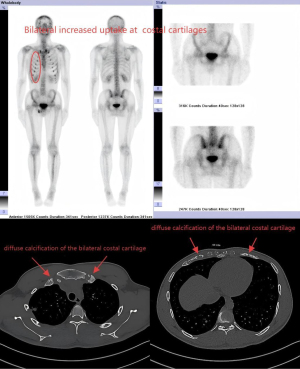 Postoperative bone scintigraphy was conducted on August 11, 2023 (Figure 3). The fusion images from the single-photon emission CT/CT scan revealed slightly increased metabolic activity in the sternum and the anterior ends of the bilateral ribs, along with corresponding bone abnormalities. Compared to the previous imaging, multiple calcifications of the costal cartilage were observed, along with reduced metabolic activity. These findings suggested possible bone changes associated with GH cell adenoma.