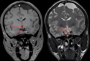 The patient, a 25-year-old male, presented to the hospital with complaints of severe snoring, paroxysmal dizziness, headache, and a weight gain of 10 kg over the past 3 months. MRI revealed an abnormal mass of the sellar region, and the possibility of a pituitary tumor was considered. On October 20, 2022, the patient underwent neuronavigation endoscopic surgery, which included tumor resection, dural incision, dural repair, and skull base reconstruction, in the Neurosurgery Department of Southwest Hospital. Postoperative pathology confirmed a diagnosis of a sparse granular GH cell adenoma. Following the surgery, the patient experienced a range of symptoms, including headache, dizziness, nasal congestion, visual disturbances (blurred and double vision), loss of vision, chills, fever, nausea, vomiting, slurred speech, loss of consciousness, and unsteady gait. The patient did not seek a timely diagnosis or treatment for these symptoms.