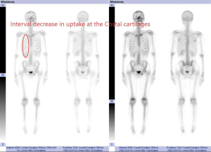 In this case, bone scintigraphy revealed distinct patterns characteristic of acromegaly, including increased metabolic activity in the sternal and the anterior ends of the bilateral ribs, as well as diffuse calcification of the costal cartilages. These findings are consistent with previous accounts of a higher prevalence of bone and joint complications in acromegaly (9,10).