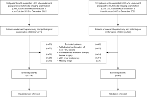Accordingly, we conducted a study to examine the association of CUS, CEUS, and MRI features with the incidence of MVI in patients with HCC. We further developed and validated a preoperative prediction nomogram, incorporating the multimodal imaging features and serological signatures for the preoperative prediction of MVI. We hope that the preoperative, noninvasive evaluation offered by our model can assist clinicians in optimizing treatment. We present this article in accordance with the TRIPOD reporting checklist (available at https://qims.amegroups.com/article/view/10.21037/qims-2025-231/rc).