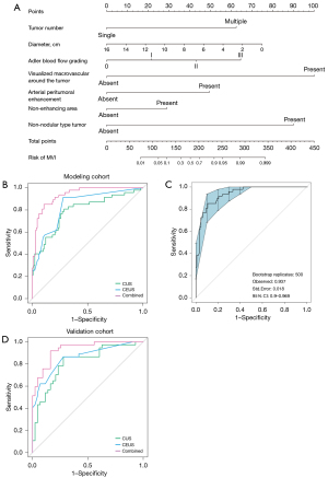 Our study investigated the predictive value of multimodal imaging for MVI in HCC. The final nomogram included radiological features from CUS, CEUS, and MR images and had higher AUCs of 0.937 and 0.932 in the modeling and validation cohorts, respectively, as compared to the model with CUS alone (modeling AUC =0.793; validation AUC =0.816) or that with CUS and CEUS (modeling AUC =0.838; validation AUC =0.860) (P<0.05).