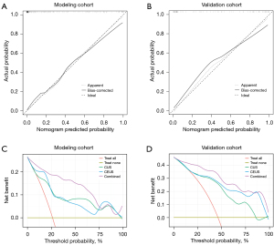 Using the independent cohort from institution two, the nomogram based on the combined model maintained high discrimination for estimating the preoperative probability of MVI, with a C-index/ROC AUC =0.932 (95% CI, 0.88–0.98). For comparison, the CUS and CEUS models achieved AUC1 =0.816 and AUC2 =0.860, respectively (AUC1 denotes CUS; AUC2 denotes CEUS); DeLong tests showed that the combined model significantly outperformed both (P<0.05) (Figure 2D). Calibration—assessing the agreement between nomogram-predicted MVI probabilities and observed MVI frequencies—demonstrated good concordance in the validation cohort (Figure 3A,3B). DCA indicated a higher net benefit for the nomogram than treat-all or treat-none strategies across clinically relevant threshold probabilities (Figure 3C,3D).