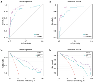 For clarity, AUC1, AUC2, and AUC3 denote the ROC area under the curve in the modeling cohort for the CUS, CEUS, and the combined model, respectively. Accordingly, the modeling AUCs were AUC1=0.793, AUC2=0.838, and AUC3=0.937. In the validation cohort, the AUCs were 0.816, 0.860, and 0.932, respectively. The DeLong test indicated a significant difference between the AUCs of the models (AUC3 vs. AUC2 vs. AUC1; P<0.05; respectively) (Figure 2A-2D). The sensitivity, specificity, PPV, and NPV of each model are shown in Table 2.