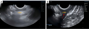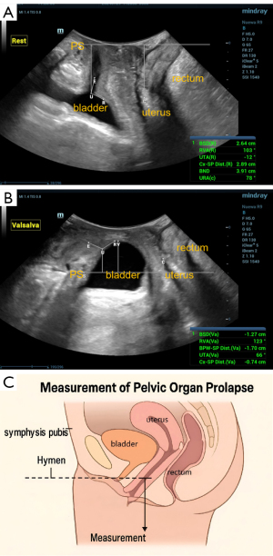 The abdominal volume probe (SD 8-1U) under transperineal guidance was used to obtain the standard median sagittal section of the pelvic floor, with the indicator point facing the ventral side of the patient and the direction of the sound beam parallel to the sagittal plane of the human body (6,7). For imaging analysis, a single optimal frame demonstrating the maximal descent during the most effective Valsalva trial was captured and stored for offline measurements. According to the “Chinese Expert Consensus on Pelvic Floor Ultrasonography (2022 edition)”, the degree of POP was determined in the maximum Valsalva position. The lowest point of the posterior bladder wall or the junction between the bladder neck and urethra was taken as the landmark structure of anterior pelvic prolapse, and the lowest point of the cervix was taken as the landmark structure of middle pelvic prolapse.