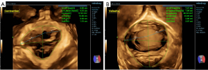 The intelligent measuring kit was used to measure the bilateral levator-urethral gap (LUG) (in contraction, the distance between the LAM and the midline of the urethra is 25 mm, which is the critical value for diagnosing LAM injury. For Asians, 23.4 mm can also be used as the critical value; during the Valsalva state, LHA <25 cm2, for Asians, refer to <20 cm2) (7-10) (Figure 4).