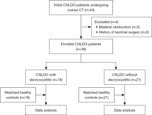 The enrolled CNLDO patients were excluded if they had bilateral obstruction, a history of lacrimal surgery, facial fractures, or significant trauma. For the control group, in addition to these criteria, participants were excluded if they reported symptoms of epiphora.