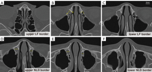 The LF height refers to the distance between the upper LF border and the lower LF border (Figure 2A,2C). This measurement was calculated by multiplying the number of sections by 0.75 mm, as reported in previous studies (22,23). In addition, the LF width was measured as the distance between the anterior extent of the LF and the posterior lacrimal crest (Figure 2B, line 1), whereas the frontal process thickness was determined at the midpoint between the anterior extent of the LF and the lacrimomaxillary suture in the level prior to the lower LF border (Figure 2B, line 2) (20). Furthermore, the NLD height was defined as the distance between the upper NLD border and the lower NLD border (Figure 2D,2F), also calculated by multiplying the number of sections by 0.75 mm. Finally, the narrowest NLD width and the upper NLD width were both determined as the transverse distances of the NLD. Specifically, the narrowest NLD width was obtained at the section with the smallest diameter of the NLD (Figure 2E), whereas the upper NLD width was measured at the upper NLD border (Figure 2D) (24).