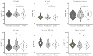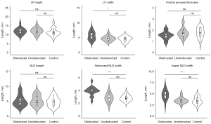 Statistical analyses were performed using the software SPSS 29.0 (IBM Corp., Armonk, NY, USA) and R statistical software (version 4.3.3; R Foundation for Statistical Computing, Vienna, Austria). To compare CNLDO patients with controls, we utilized violin plots that display the 25th percentile, median, 75th percentile, and mean values. Mann-Whitney U tests were conducted, due to non-normal distribution of several variables, to compare the control group with both the obstructed and unobstructed sides of CNLDO patients, respectively. Chi-squared test was used to compare the prevalence of sinusitis among different groups. A significance level of P<0.05 was considered statistically significant. For variables showing statistically significant differences, Cohen’s d was calculated to assess the effect size.