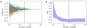 First, the radiomics features were preprocessed as follows: to ensure the stability and robustness of the radiomics features, those with an ICC below 0.8 were removed; radiomics features were then normalized using Z-score transformation. Independent sample t-tests were conducted for preliminary feature screening, selecting significant features (P<0.05). Next, Pearson correlation analysis was used to eliminate redundant features with a correlation coefficient >0.9, retaining features with a higher linear correlation coefficient to the target parameter. Finally, key features were selected using least absolute shrinkage and selection operator (LASSO), with the optimal parameter λ determined through 10-fold cross-validation, and features with non-zero coefficients were selected.