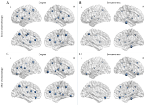 The Hubs of the children with ALL before and after chemotherapy were constructed based on the Deg and Bet, respectively. In relation to the Deg, 16 core nodes were identified before and after chemotherapy, respectively, which constituted distinct sets. In relation to the Bet, there were 13 and 15 core nodes before and after chemotherapy, respectively. The specific nodes are shown in Table 1 and Figure 5.