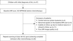 In total, 47 newly diagnosed children with ALL were enrolled in the study; eight patients were excluded under the exclusion criteria due to CNS leukemia (n=4) and abnormal signals on the baseline MRI scan (n=4). On days 46–52 of the follow-up period, 11 patients were unable to or refused to attend follow-up (e.g., severe infection and granulocytopenia). In total, 28 children with ALL were followed-up, and two children were excluded due to poor image quality. Ultimately, 26 children with ALL were included in the study (Figure 1).