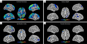 Compared to the depths before chemotherapy, the depths of the sulcus of the left superior frontal, caudal anterior cingulate, and rostral anterior cingulate, the right postcentral, superior parietal, supramarginal, inferior parietal, lateral occipital, precuneus, insula, and transverse temporal areas were shallower in the children with ALL who achieved CR on days 46–52 of chemotherapy (cluster size ≥50, P<0.05, FWE corrected; Figure 2B).