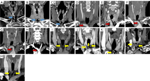 Patients underwent CECT/CTV imaging using a 320-row detector computed tomography (CT) scanner (Aquilion One Vision; Canon Medical Systems Corporation, Otawara, Japan). The scanning parameters were as follows: tube voltage, 120 kVp; tube current, 200 mA; detector collimation, 0.625 mm; and matrix, 512×512. CECT images were obtained at 90 seconds after contrast material administration (Omnipaque, GE Healthcare, Chicago, USA, 2 mL/kg or 300 mg/mL). Subsequently, bolus tracking was performed with the region of interest (ROI) setting on the ascending aorta. Contrast material (5.0 mL/s) was with an 18- or 20-gauge catheter injected into antecubital vein by using a power injector (Dual Shot; Nemoto Kyorindo, Tokyo, Japan). The scanning range was roughly from skull base to the lower edge of aortic arch, in attempt to cover all the interested anatomies. The CECT/CTV images were then reconstructed with Adaptive Iterative Dose Reduction 3D standard software (AIDR 3D, Canon Medical Systems), for reconstruction section thickness and interval of 0.5 mm.