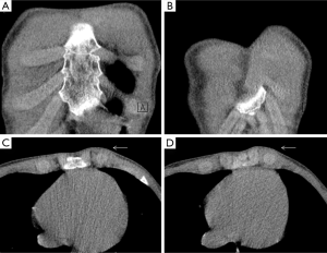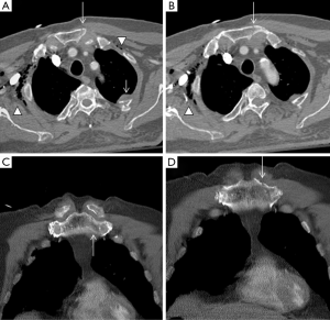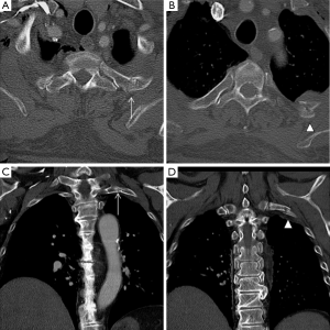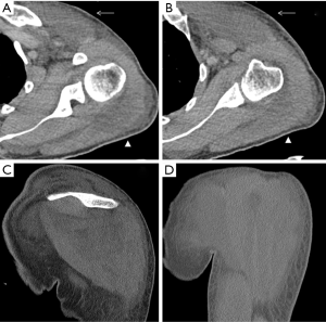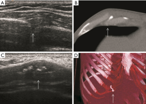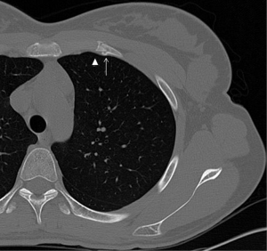In conclusion, different types of traumatic events affecting the chest wall, such as rib and costal cartilage fractures, sternoclavicular dislocation and soft tissue lesions may be misdiagnosed with conventional X-ray. MDCT is considered the “gold-standard” for traumatic patients (especially polytraumatized patients), due to its fast acquisition covering the whole area of interest in axial plane (including other anatomic areas at the same time), reconstructing multiplanar (2D, 3D) volume-rendered images with a superb quality and angiographic CT capabilities for evaluating vascular injury (1,3) with changing management in up to 20% of chest trauma patients (4). However, radiologists must be aware of unnecessarily MDCT scans expose patients to potentially harmful ionizing radiation (5,6). In front of subtle rib fractures and muscle-tendinous tears, complementary techniques such as US and MRI may improve the diagnostic accuracy (19,20,32,35,38,42). All these imaging methods have an important role in quantifying the severity of chest wall trauma.