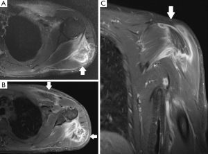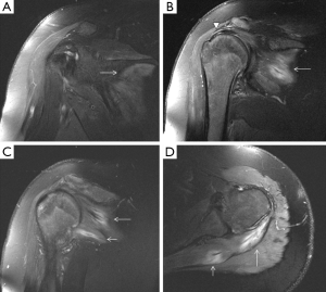 - Tomas X, Peidro L, Ortiz J, Pomes J, Cores E, Garcia AI, Bianchi L. Simultaneous muscle strain at the point of attachment to the scapula of the rotator cuff muscles: MRI findings. Clin Radiol 2004;59:621-4. [Crossref] [PubMed]