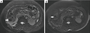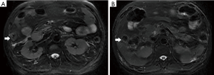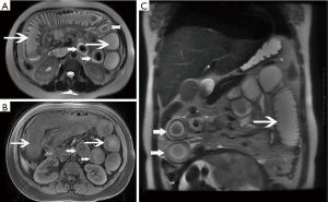 On the MR images, AP was categorized as edematous and necrotic pancreatitis (20). The severity of AP was graded according to MRSI (20). According to MRSI, AP was divided into mild, moderate and severe APs (MRSI was 0–3, 4–6, 7–10 points separately) (20,21). We divided the gastrointestinal tract anatomy into stomach, duodenum, jejunum, ileum, ascending colon (including the ileocecal junction), transverse colon (including the hepatic flexure and splenic flexure), descending colon and the sigmoid colon. Wall thickening was defined as over 10 mm for stomach wall and over 3 mm for intestine, when their lumens were well distended (22-24). Abnormalities of the thickened gastrointestinal tract walls included the degree of thickening, signal intensity change, and symmetric versus asymmetric thickening. Lumen dilatation was defined as diameter over 30 mm for small intestine and over 60 mm for the colon (24).