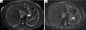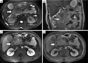 MRI was performed on a 1.5-T MR scanner with 38 mT/M gradients and 120 mT/M per second slope (Signa Excite; GE Medical Systems, Milwaukee, WI, USA) using a phased array torso-pelvis coil. No antiperistaltic agent or enteric contrast was administered. The coverage area of axial scan was apex of the liver to the umbilical. The sequences included axial fast spoiled gradient echo (FSPGR) T1-weighted imaging with fat suppression [repetition time (TR) ms/echo time (TE) ms =150–170/1.6; flip angle =80°; matrix =512×160–192; field of view (FOV) =26–32 cm; section thickness =5 mm; number of excitation (NEX) =1], gradient-echo (GRE) T1-weighted in-phase and out-of-phase MR imaging (TR ms/TE ms =150/4.4, 2.2; flip angle =90°; matrix =256×192–224; FOV=26–32 cm; section thickness =5 mm; NEX =1), respiratory-triggered (R-T) axial fast recovery fast spin-echo (FRFSE) T2-weighted MR imaging with fat suppression (TR ms/TE ms =10,000–12,000/90–100, TR determined by the frequency of respiration; section thickness = 5 mm; intersection gap =0.5 mm; matrix =256×192; NEX =3; and FOV =34 cm × 34 cm), coronal and axial single shot fast spin-echo (SSFSE) T2-weighted MR imaging (TE =90–100 ms; 2 s between slice acquisitions; section thickness =5 mm; intersection gap =0.5 mm; matrix =384×224; one-half signal acquired; and FOV =33 cm × 33 cm), SSFSE radial series slabs MR cholangiopancreatography (MRCP) (TE =1,300 ms; 6 s between image acquisitions; section thickness =40 mm; matrix =384×224; one-half signal acquired; FOV =30 cm × 30 cm), and three-dimension (3D) FSPGR dynamic enhanced MR imaging. Dynamic enhanced imaging was performed with an axial fat saturated 3D FSPGR sequence. Gadolinium chelate (Magnevist, Schering Guangzhou Co., China) was administered (0.2 mmol/L per kilogram of body weight) intravenously at approximately 3.5 mL/s by projector (Spectris MR Injection System, Medrad Inc., USA) injection, followed by a 20-mL saline solution flush. First-pass arterial enhancement was optimized with a timing bolus sequence (axial FMPSPGR). Dynamic imaging was performed during breath-holding before the injection (unenhanced), immediately after the injection (hepatic arterial phase), 30 s after the injection (early venous phase), and 1 min after the injection (late venous phase). An additional delayed phase was acquired using 2D FSPGR fat suppression axial T1-weighted imaging.