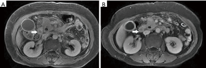 In this study gastrointestinal tract wall thickening was the most common finding in AP patients. Inflammatory substances can stimulate the gastrointestinal tract in patients with AP, leading to the excessive output of gastric juices and subsequent mucosal and submucosal edema (27). Some patients exhibit a three-layer structure referred to as the “target sign” (28). Tolan et al. (29) considered this pattern acute wall edema, and noted a direct correlation with inflammatory activity. In this study we found most AP patients exhibited gastrointestinal tract wall thickening, some with a stratified appearance on MRI that was similar to the “target sign” (28). After treatment, the mural stratification resolved on follow-up MRI. Our results suggested that the thickened intestinal wall in AP patients is derived from acute wall edema and can resolve soon after treatment.