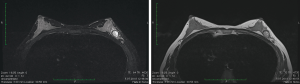 A 49-year-old postmenopausal woman was admitted to our department with a diagnosis of invasive breast cancer achieved by a local clinic presenting with bilateral PND. Physical examination showed a left breast mass at upper outer quadrant with skin and nipple retraction without any palpable lymph nodes in the axilla. Mammogram and ultrasound showed an irregular mass in a high dense breast, with a diameter of 68 mm, which is suspicious, indicating BIRADS 4c. In addition, MRI revealed satellite lesions around the primary tumor, with a diameter of 9 and 7 mm, which was confirmed as malignant with core biopsies. In the ultrasound and MRI, no suspicious lymph nodes were demonstrated (Figure 1). Positron emission tomography showed a left breast mass with SUVmax 16.22 and an axillary lymph node swelling with a SUVmax range of 3.14. No definitive finding of distant metastases was recognized with these modalities. Core biopsy report of the primary tumor showed a grade II invasive ductal carcinoma that did not overexpress the estrogen receptor (ER) or progesterone receptor (PR) and did not express a human epidermal growth factor receptor 2 (HER2), indicating that it was a triple negative tumor. The patient had no known family history of breast or ovarian cancer. Genetic testing revealed c.5265_5266insC (p.Gln1756ProfsTer74) BRCA1 mutation. She was a Caucasian and unaware of any Ashkenazi Jewish heritage. Since she was initially admitted with a locally advanced triple negative invasive cancer, neoadjuvant chemotherapy as carboplatin in addition to weekly paclitaxel, followed by dose-dense doxorubicin and cyclophosphamide was administered. The patient underwent bilateral skin-sparing mastectomy after neoadjuvant chemotherapy and left sentinel lymph node biopsy that revealed negative for cancer cells (0/4) in the frozen section. There were no significant complications; including bleeding, thrombosis or implant loss. Histopathological paraffin evaluation of surgical specimens showed a partial pathological complete response (PCR) with 22 mm residual disease in the breast without any lymph node involvement. Postoperative radiation therapy to her chest-wall and regional lymph node was performed as adjuvant therapy, and she was ambulatory followed without any recurrence at two years follow-up.