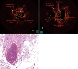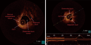 The incidence of malignancy in patients with pathologic nipple discharge (PND) varies from 1% to 23% (1). Currently, methylene blue dye or lacrimal probe guided isolated duct excision is still the standard treatment of PND. Majority of those patients are not with cancer-involved ducts and have unnecessary surgery to reveal the definitive histopathology. With conventional imaging, it is not possible to understand whether those ducts involve cancer or not (2). It is well established that ductoscopy is a novel technique that could diagnose a single papilloma; however, it is insufficient to diagnose an in situ or invasive cancer (3,4). Currently, optical coherence tomography (OCT) is used as a non-invasive imaging test that utilizes light waves to capture cross-sectional pictures of retina or coronary arteries (5). In our novel approach, a miniaturized OCT catheter is inserted into the breast ductal system via the nipple orifices to provide detailed real-time imaging of breast ductal epithelial anatomy.