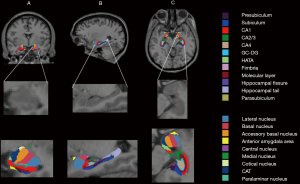 - Saygin ZM, Kliemann D, Iglesias JE, van der Kouwe AJ, Boyd E, Reuter M, Stevens A, Van Leemput K, McKee A, Frosch MP, Fischl B, Augustinack JC. Alzheimer's Disease Neuroimaging Initiative. High-resolution magnetic resonance imaging reveals nuclei of the human amygdala: manual segmentation to automatic atlas. Neuroimage 2017;155:370-82. [Crossref] [PubMed]
